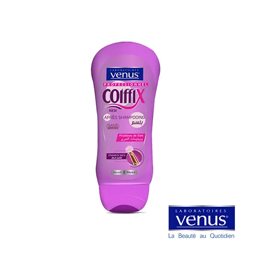 Qu’ils soient rêches ou bouclés, l’après-shampooing démêlant COIFFIX, riche en Protéines de Soie, mis au point par les Laboratoires Vénus, a l’avantage de protéger votre kératine et préserve vos cheveux contre toute agression externe.
